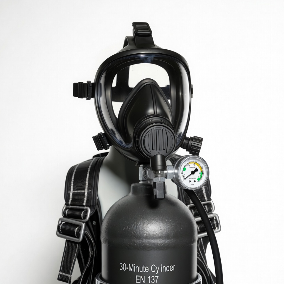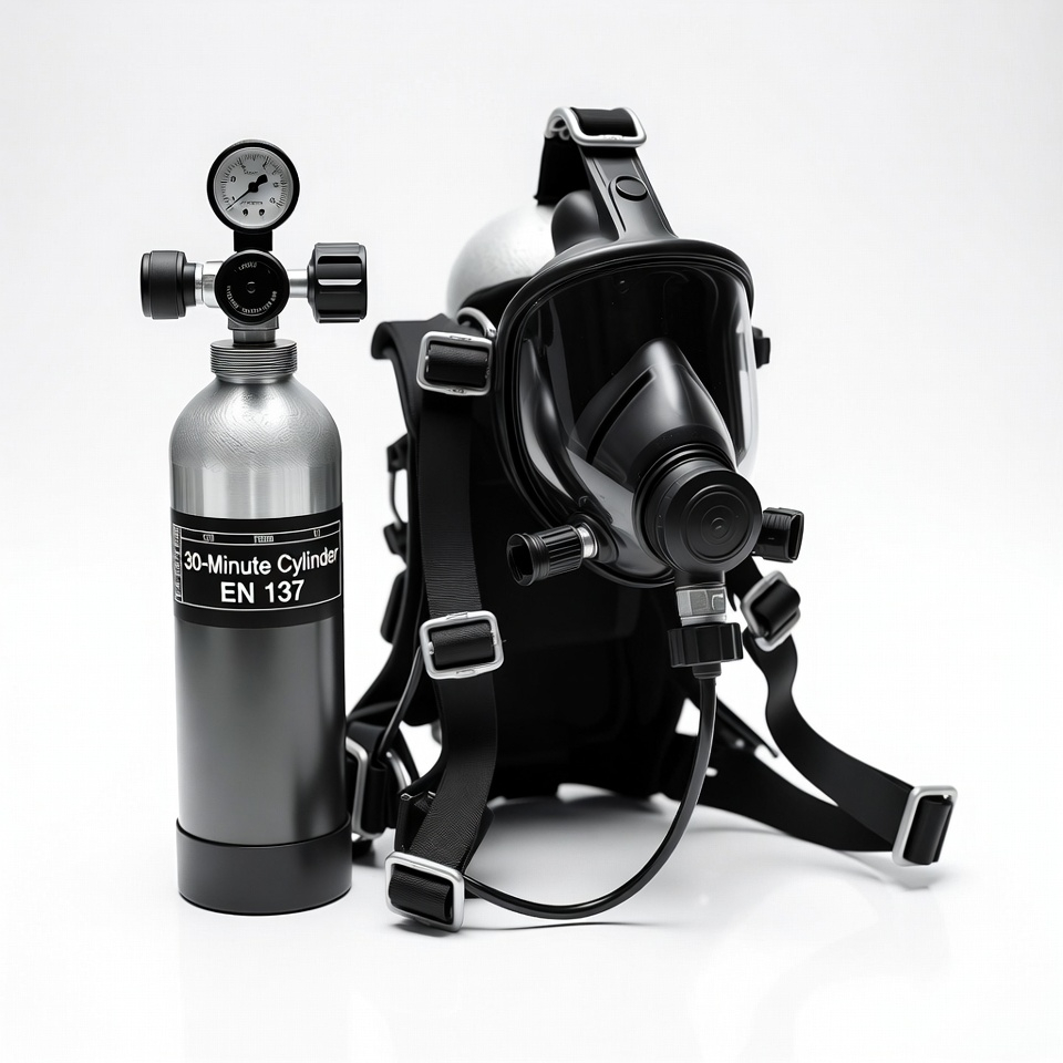 Our EN 137:2006 Type 1 certified 30-Minute SCBA features a 6.8L carbon composite cylinder pressurized to 300 bar — delivering a rated 30-minute air supply at 40L/min consumption — with a positive-pressure demand valve, full-face mask, and integrated PASS device, engineered for confined space entry, hazardous atmosphere, and emergency response operations across industrial, construction, oil & gas, and facilities management environments throughout the UAE, GCC, Middle East, and Africa. Fully compliant with EN 137:2006 Type 1 and applicable regional authority requirements.