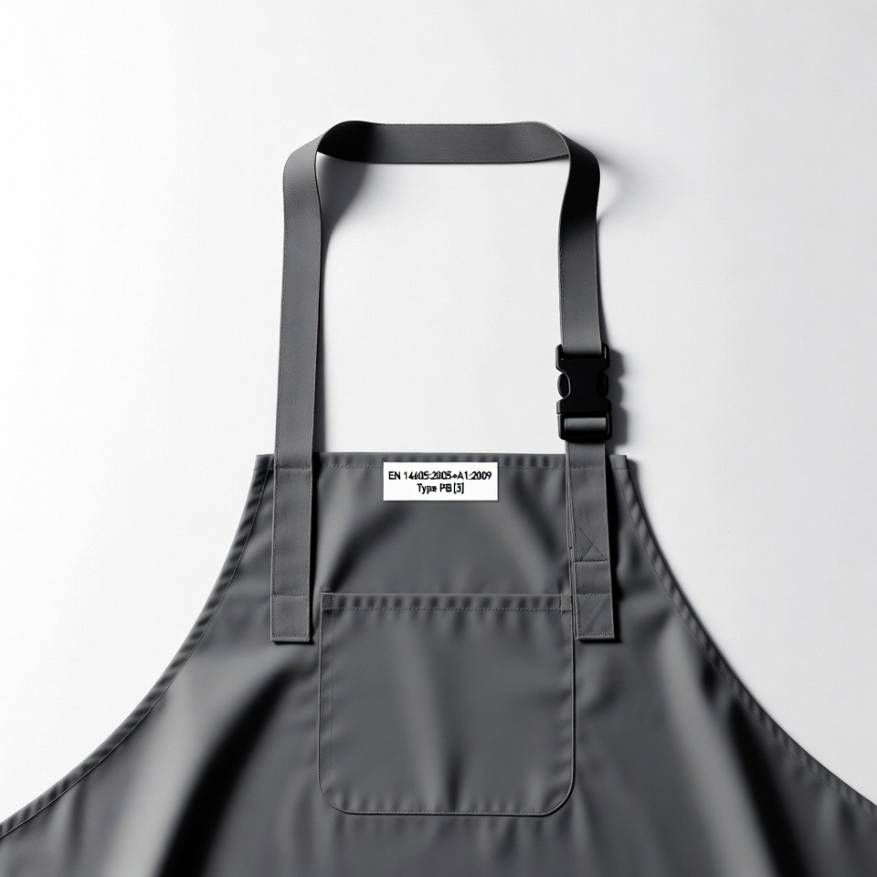 Our EN 14605 Type PB[3] certified Chemical Resistant Aprons feature a coated polyester or PVC laminate fabric — permeation tested against a minimum of 6 chemicals over an 8-hour breakthrough period per EN 16523-1 — with liquid-tight heat-welded seams providing partial body protection against chemical liquid jets, splashes, and hazardous substance contact across industrial, oil & gas, and facilities management operations throughout the UAE, GCC, Middle East, and Africa.