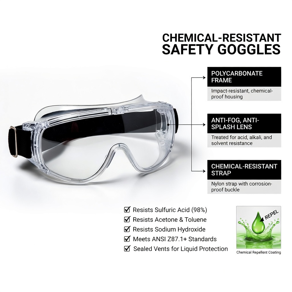 Chemical Protection: Rated Code 3 (EN 166) — sealed against liquid droplets, acid, alkali, and solvent splashes