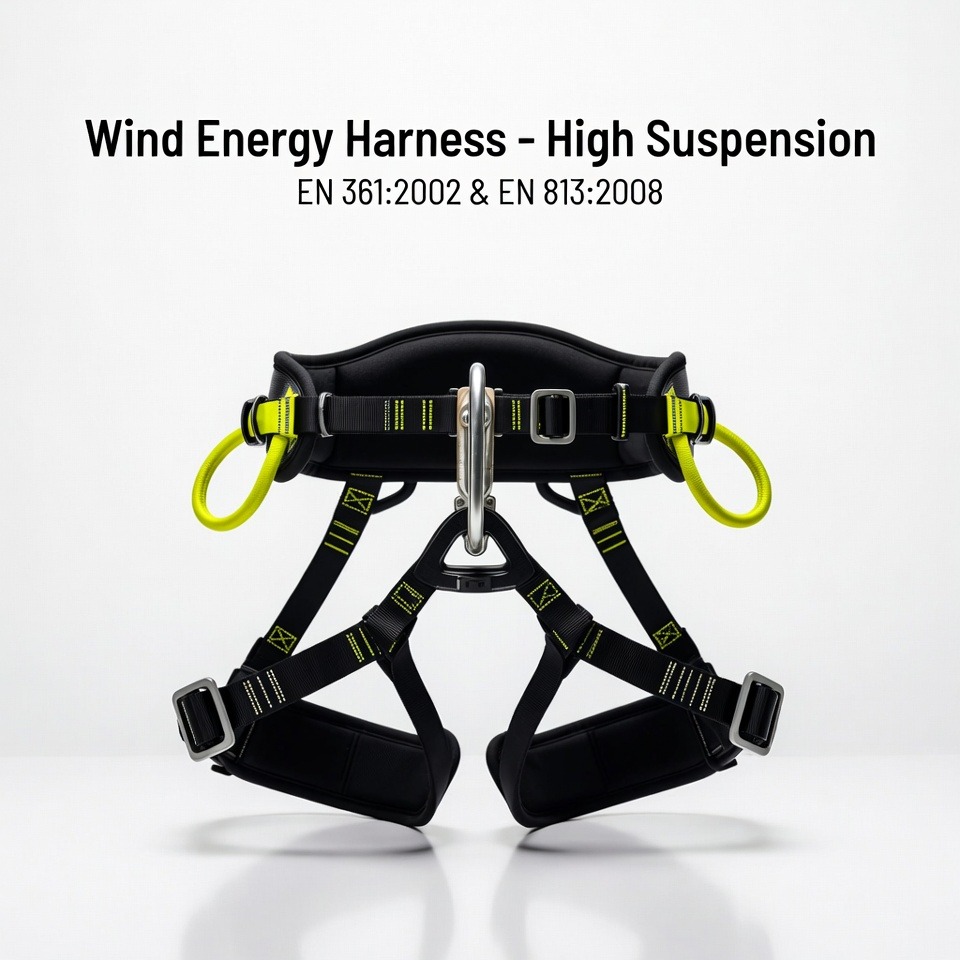 Our EN 361 and EN 813 dual-certified Wind Energy Harness combines fall arrest capability — static strength tested at 15 kN for 3 minutes — with an EN 813 certified sit harness configuration featuring padded leg loops and a ventral suspension D-ring, purpose-engineered for prolonged high-suspension operations inside wind turbine towers and nacelles across the UAE, GCC, Middle East, and Africa.